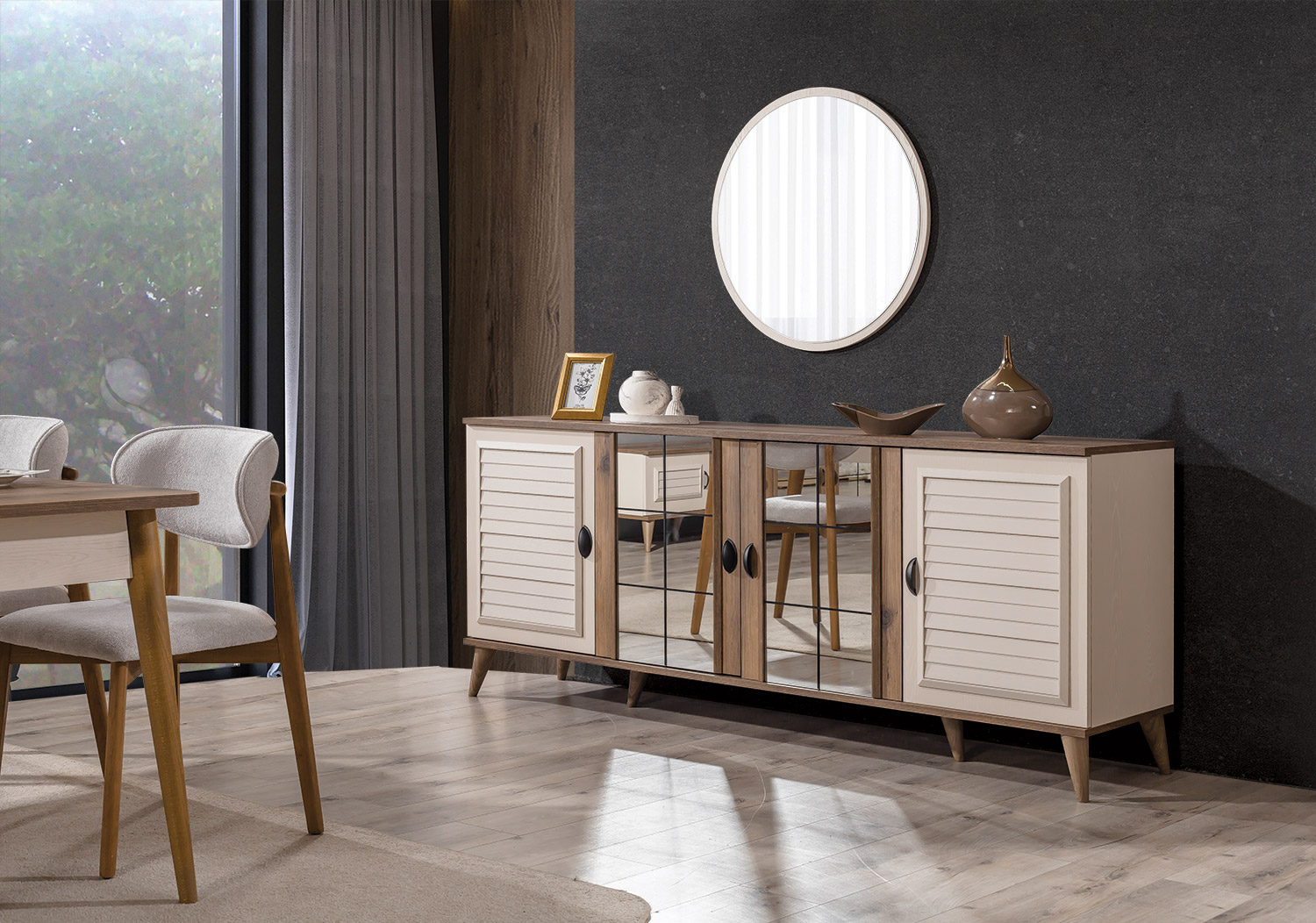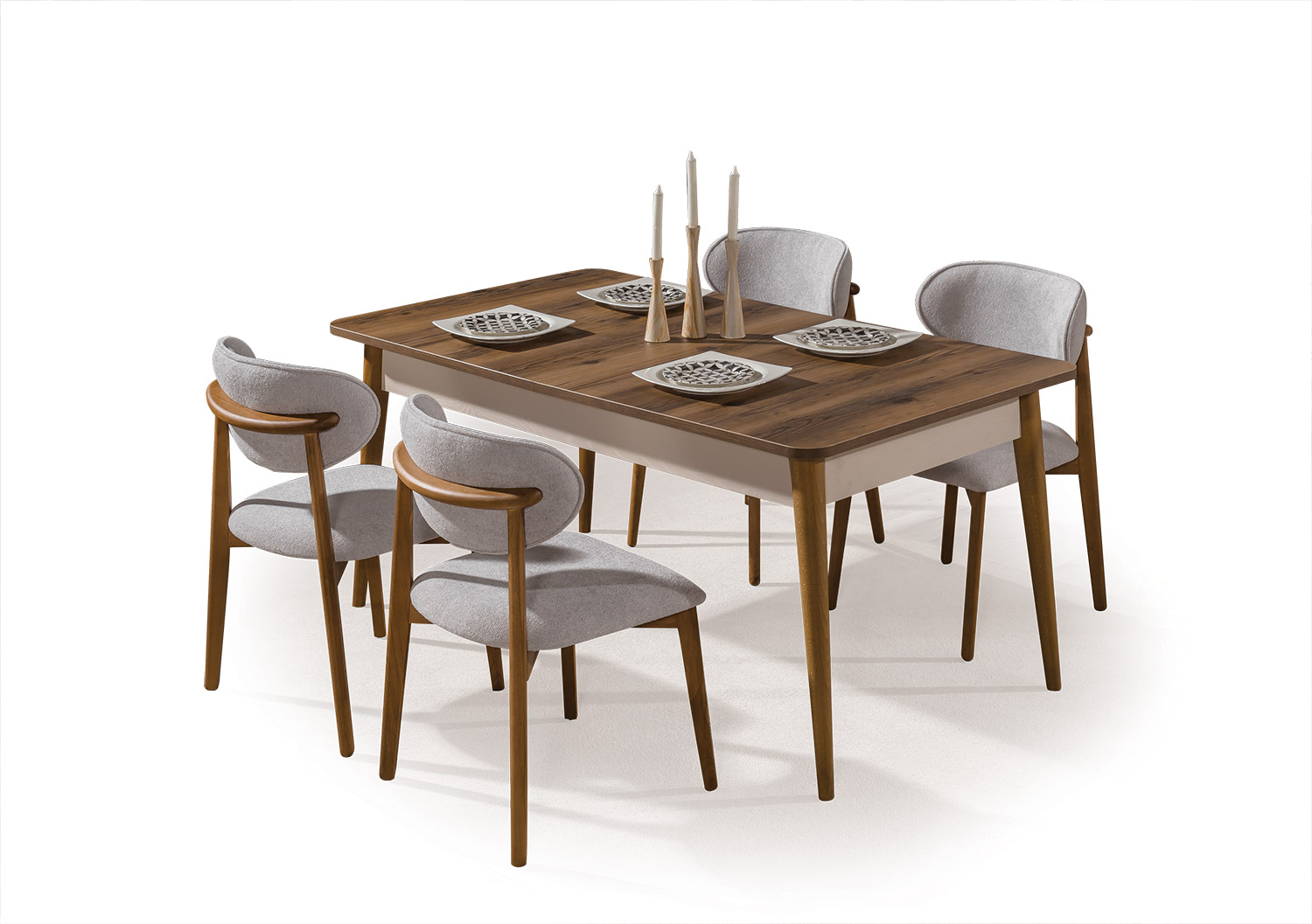 Takım içeriği; 1 adet yemek masası, 6 adet sandalye, 1 adet konsol ve aynasından oluşmaktadır.